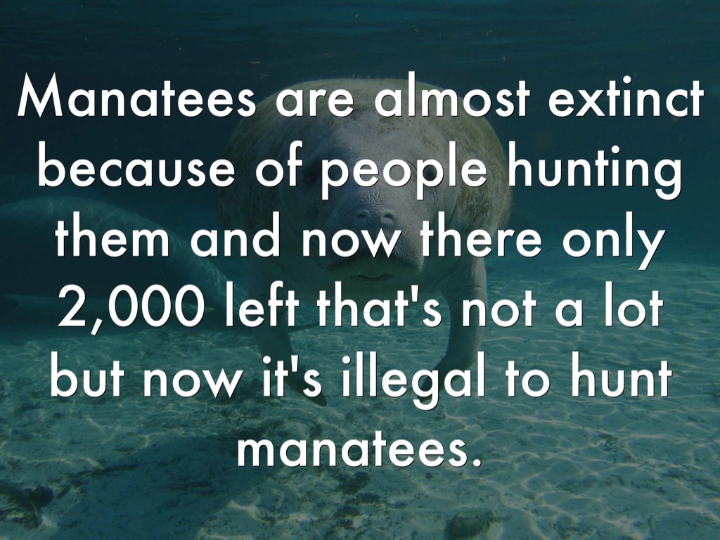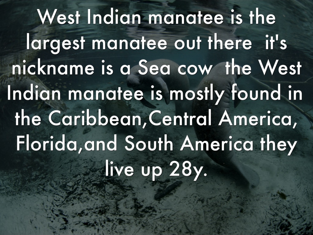 West Indian manatee is the largest manatee out there it's nickname is a Sea cow the West Indian manatee is mostly found in the Caribbean,Central America, Florida,and South America they live up 28y.