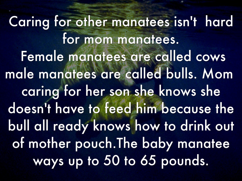 Caring for other manatees isn't hard for mom manatees. Female manatees are called cows male manatees are called bulls. Mom caring for her son she knows she doesn't have to feed him because the bull all ready knows how to drink out of mother pouch.The baby manatee ways up to 50 to 65 pounds.