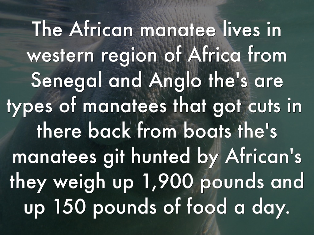 The African manatee lives in western region of Africa from Senegal and Anglo the's are types of manatees that got cuts in there back from boats the's manatees git hunted by African's they weigh up 1,900 pounds and up 150 pounds of food a day.