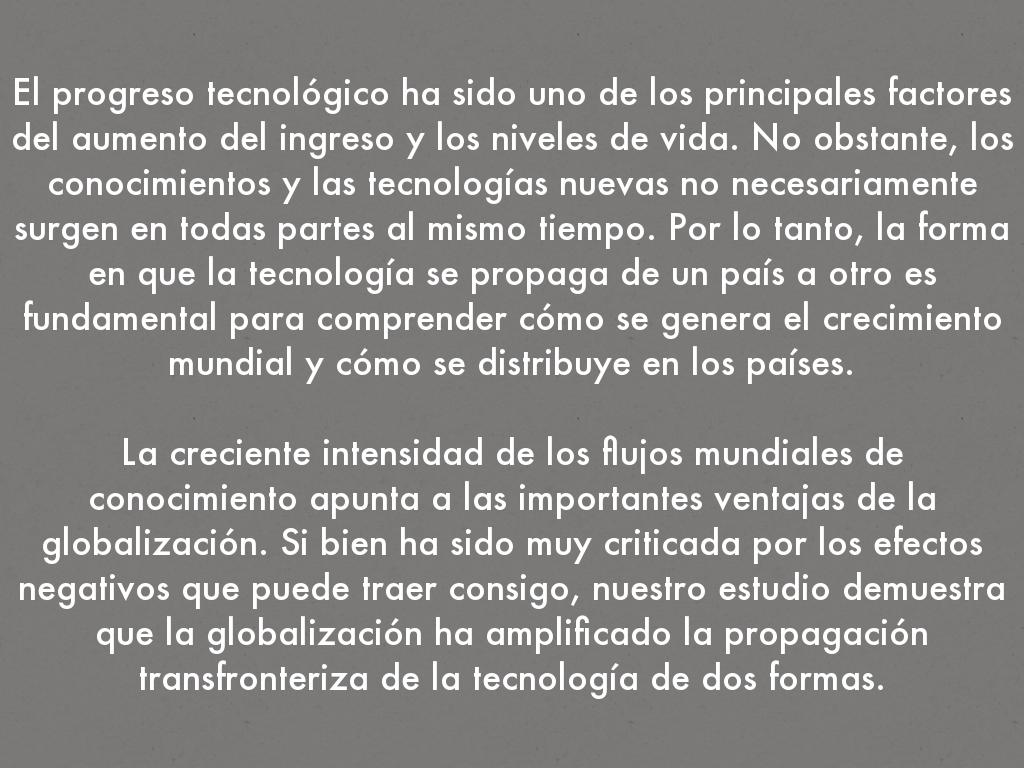 El progreso tecnológico ha sido uno de los principales factores del aumento del ingreso y los niveles de vida. No obstante, los conocimientos y las tecnologías nuevas no necesariamente surgen en todas partes al mismo tiempo. Por lo tanto, la forma en que la tecnología se propaga de un país a otro es fundamental para comprender cómo se genera el crecimiento mundial y cómo se distribuye en los países.