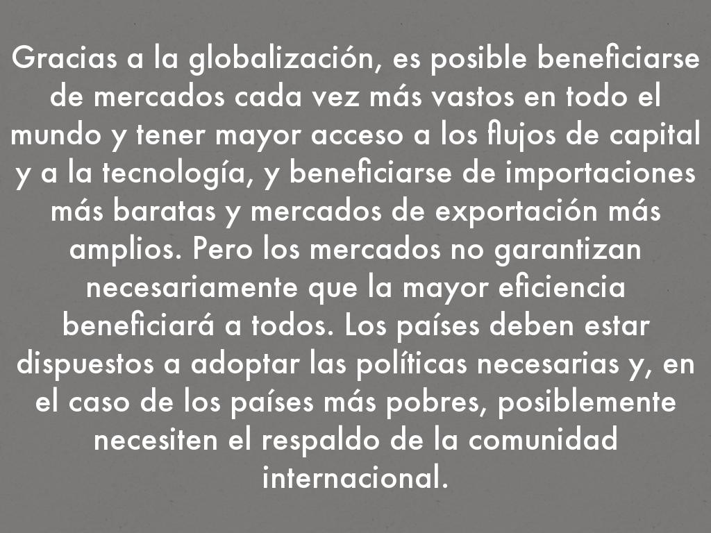 Gracias a la globalización, es posible beneficiarse de mercados cada vez más vastos en todo el mundo y tener mayor acceso a los flujos de capital y a la tecnología, y beneficiarse de importaciones más baratas y mercados de exportación más amplios. Pero los mercados no garantizan necesariamente que la mayor eficiencia beneficiará a todos. Los países deben estar dispuestos a adoptar las políticas necesarias y, en el caso de los países más pobres, posiblemente necesiten el respaldo de la comunidad internacional.