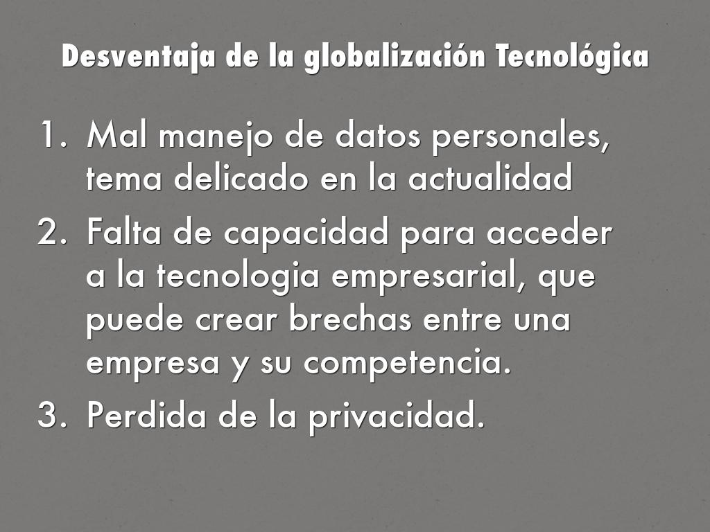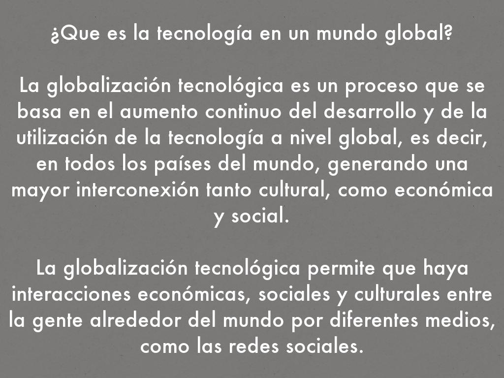 La globalización tecnológica es un proceso que se basa en el aumento continuo del desarrollo y de la utilización de la tecnología a nivel global, es decir, en todos los países del mundo, generando una mayor interconexión tanto cultural, como económica y social.