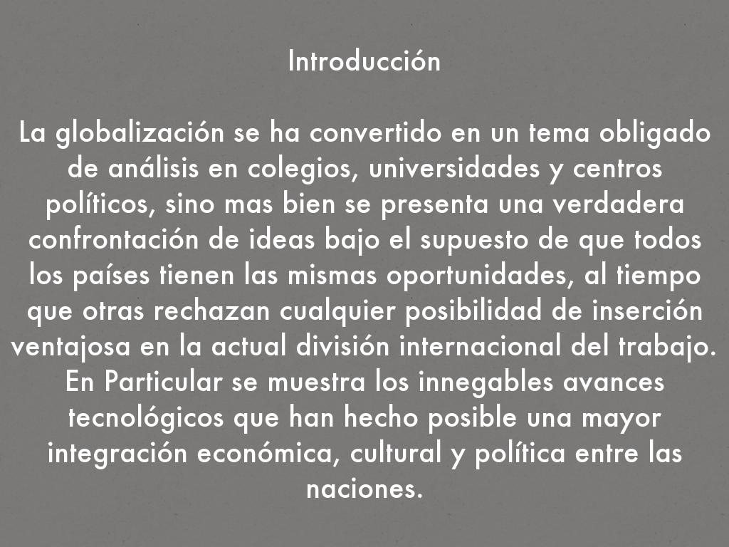 La globalización se ha convertido en un tema obligado de análisis en colegios, universidades y centros políticos, sino mas bien se presenta una verdadera confrontación de ideas bajo el supuesto de que todos los países tienen las mismas oportunidades, al tiempo que otras rechazan cualquier posibilidad de inserción ventajosa en la actual división internacional del trabajo.