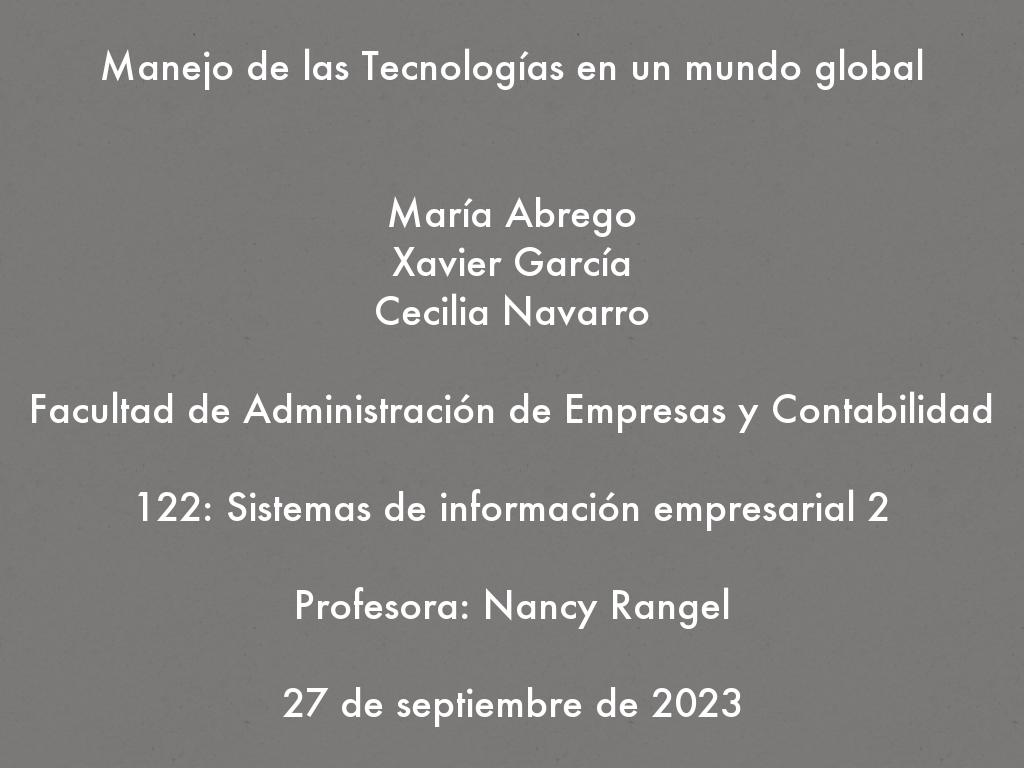 Manejo de las tecnologías en un mundo global María Abrego Xavier García Cecilia Navarro Facultad de Administración de Empresas y Contabilidad 122: Sistemas de información empresarial 2 Profesora: Nancy Rangel 27 de septiembre de 2023