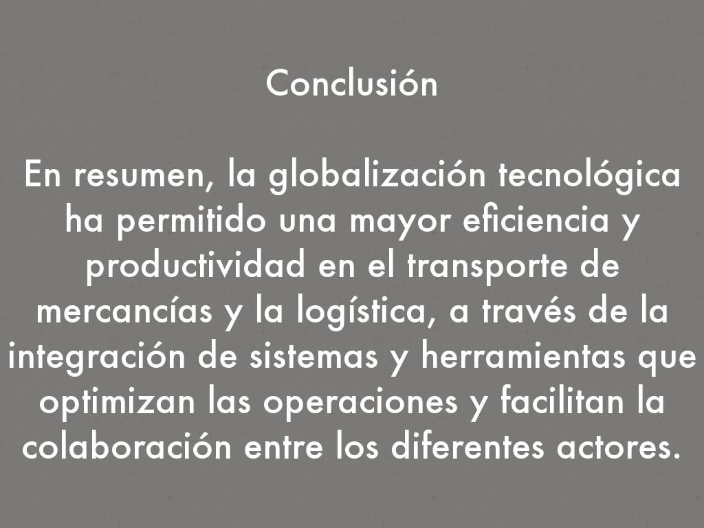En resumen, la globalización tecnológica ha permitido una mayor eficiencia y productividad en el transporte de mercancías y la logística, a través de la integración de sistemas y herramientas que optimizan las operaciones y facilitan la colaboración entre los diferentes actores.