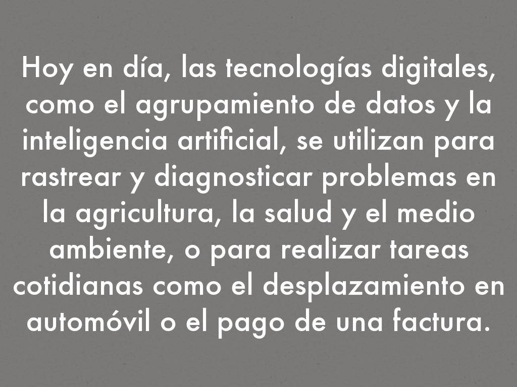 Hoy en día, las tecnologías digitales, como el agrupamiento de datos y la inteligencia artificial, se utilizan para rastrear y diagnosticar problemas en la agricultura, la salud y el medio ambiente, o para realizar tareas cotidianas como el desplazamiento en automóvil o el pago de una factura.