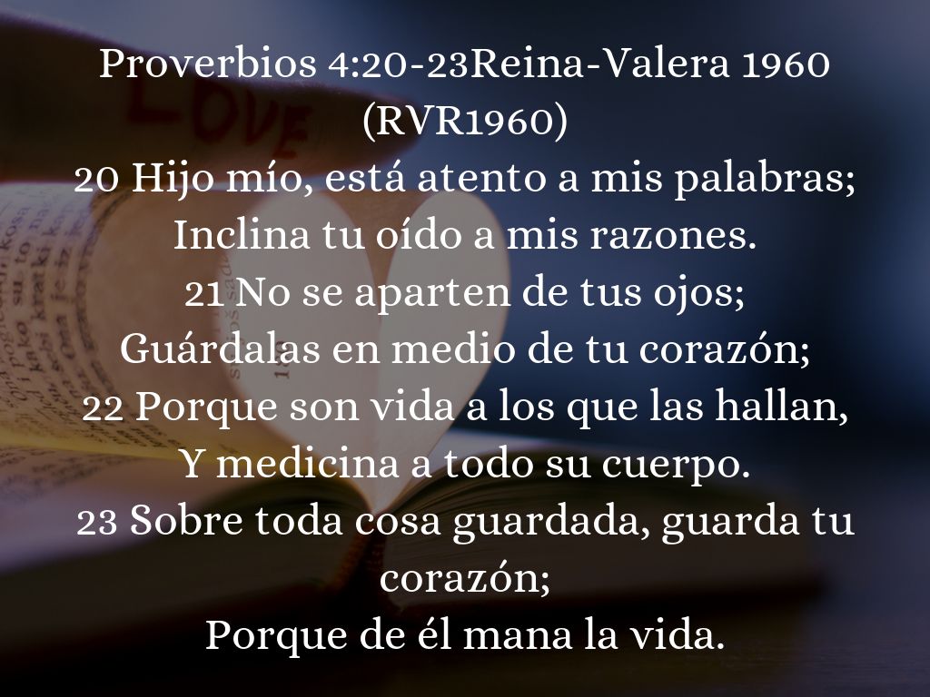 Proverbios 4:20-23Reina-Valera 1960 (RVR1960) 20 Hijo mío, está atento a mis palabras; Inclina tu oído a mis razones. 21 No se aparten de tus ojos; Guárdalas en medio de tu corazón; 22 Porque son vida a los que las hallan, Y medicina a todo su cuerpo. 23 Sobre toda cosa guardada, guarda tu corazón; Porque de él mana la vida.