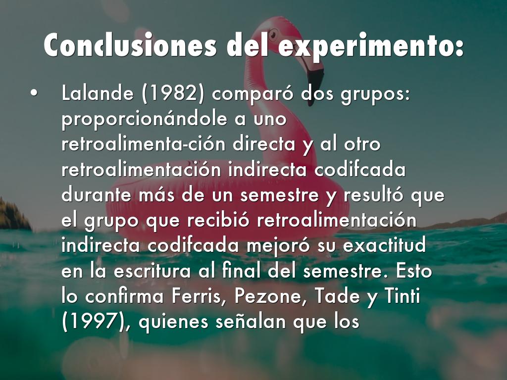 Lalande (1982) comparó dos grupos: proporcionándole a uno retroalimenta-ción directa y al otro retroalimentación indirecta codifcada durante más de un semestre y resultó que el grupo que recibió retroalimentación indirecta codifcada mejoró su exactitud en la escritura al final del semestre. Esto lo confirma Ferris, Pezone, Tade y Tinti (1997), quienes señalan que los estudiantes que recibieron retroalimentación indirecta codificada cometen menos errores en los escritos posteriores que quienes recibieron retroalimentación directa.