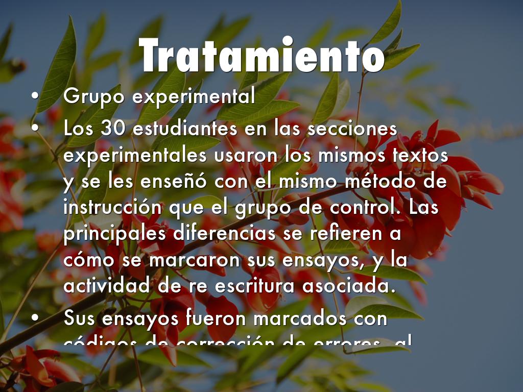 Los 30 estudiantes en las secciones experimentales usaron los mismos textos y se les enseñó con el mismo método de instrucción que el grupo de control. Las principales diferencias se refieren a cómo se marcaron sus ensayos, y la actividad de re escritura asociada.