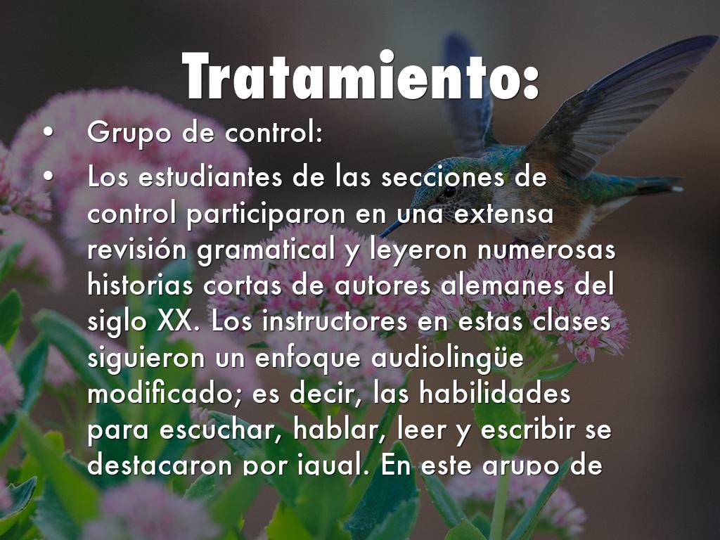 Los estudiantes de las secciones de control participaron en una extensa revisión gramatical y leyeron numerosas historias cortas de autores alemanes del siglo XX. Los instructores en estas clases siguieron un enfoque audiolingüe modificado; es decir, las habilidades para escuchar, hablar, leer y escribir se destacaron por igual. En este grupo de treinta estudiantes, los ensayos se corrigieron de la manera tradicional, es decir, el maestro ingresó todas las correcciones a los exámenes de los estudiantes y luego les pidió que los incorporaran en una versión regrabada.