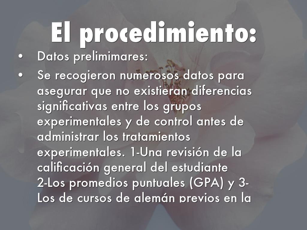 Se recogieron numerosos datos para asegurar que no existieran diferencias significativas entre los grupos experimentales y de control antes de administrar los tratamientos experimentales. 1-Una revisión de la calificación general del estudiante