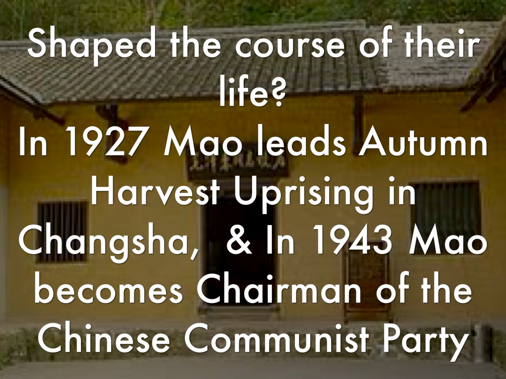 In 1927 Mao leads Autumn Harvest Uprising in Changsha, & In 1943 Mao becomes Chairman of the Chinese Communist Party
