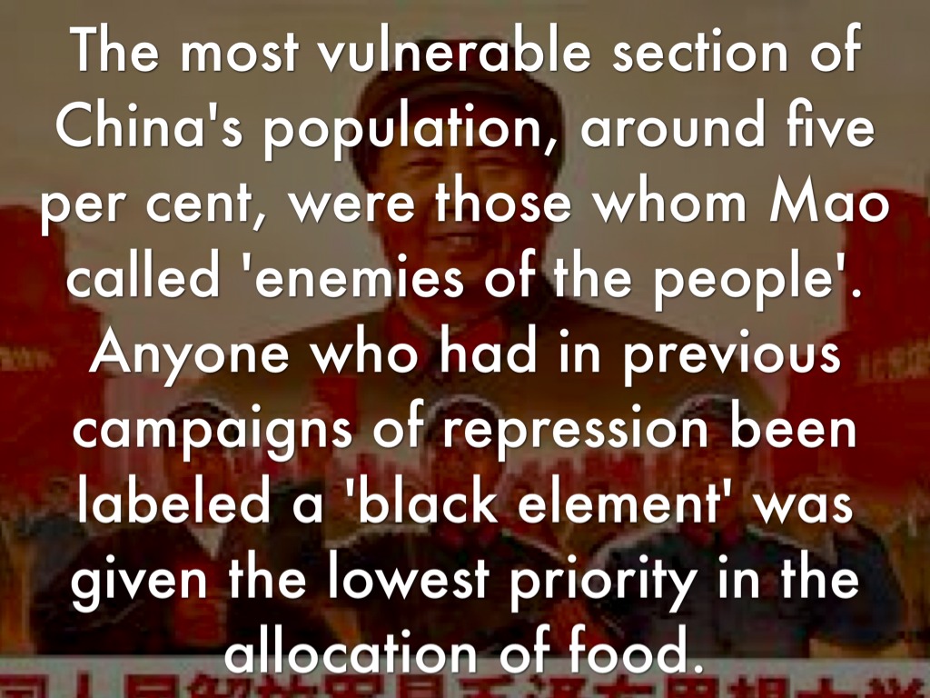 The most vulnerable section of China's population, around five per cent, were those whom Mao called 'enemies of the people'. Anyone who had in previous campaigns of repression been labeled a 'black element' was given the lowest priority in the allocation of food.