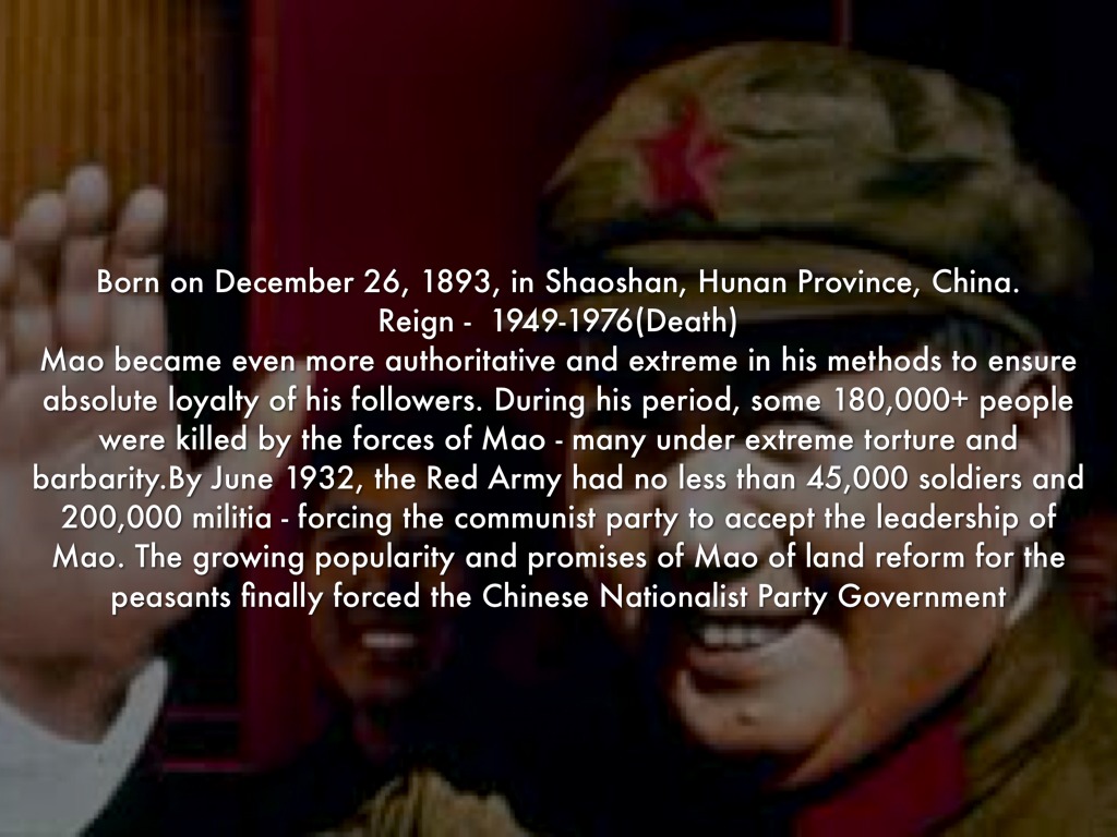 Mao became even more authoritative and extreme in his methods to ensure absolute loyalty of his followers. During his period, some 180,000+ people were killed by the forces of Mao - many under extreme torture and barbarity.By June 1932, the Red Army had no less than 45,000 soldiers and 200,000 militia - forcing the communist party to accept the leadership of Mao. The growing popularity and promises of Mao of land reform for the peasants finally forced the Chinese Nationalist Party Government