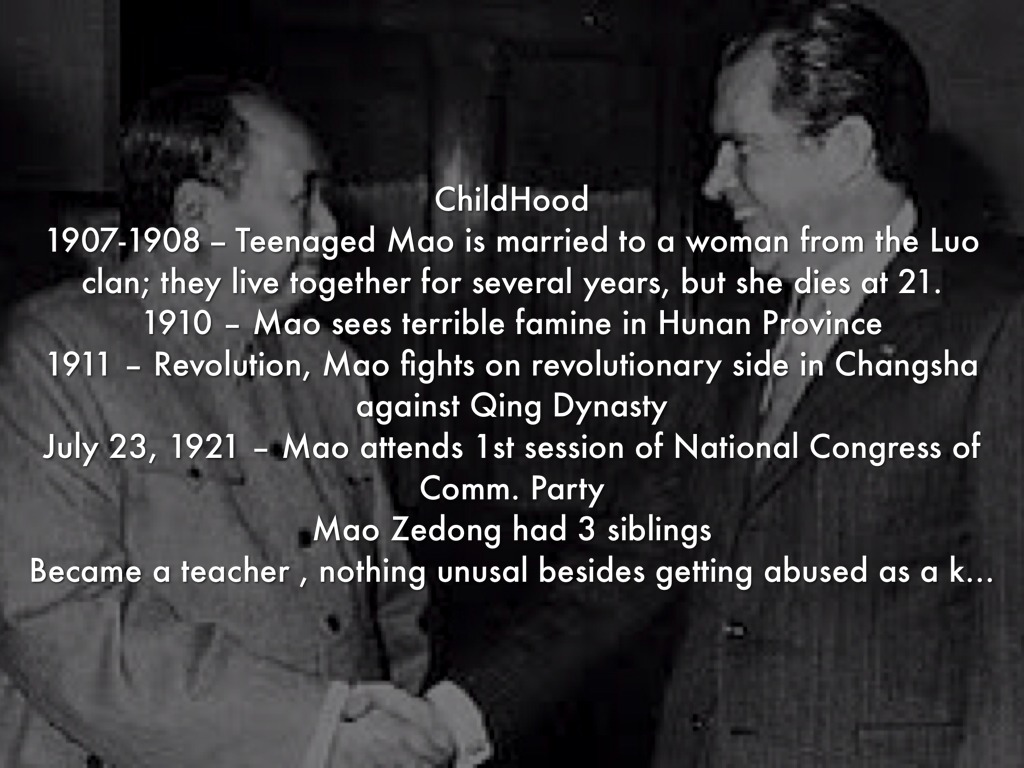 1907-1908 -- Teenaged Mao is married to a woman from the Luo clan; they live together for several years, but she dies at 21.
