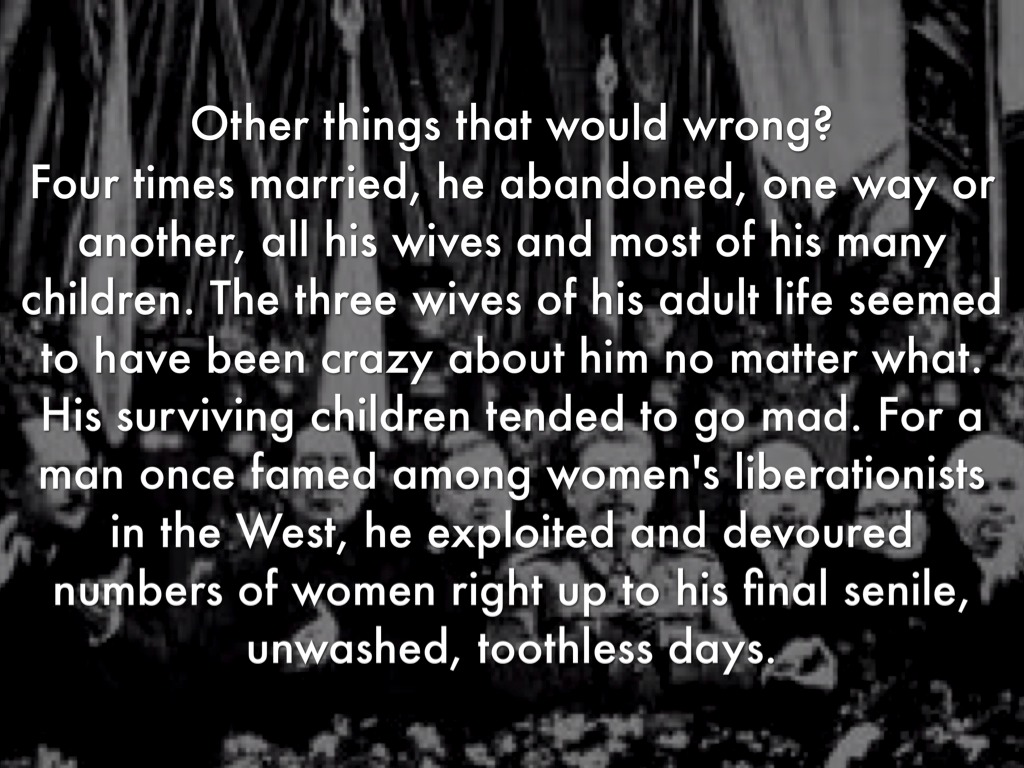 Four times married, he abandoned, one way or another, all his wives and most of his many children. The three wives of his adult life seemed to have been crazy about him no matter what. His surviving children tended to go mad. For a man once famed among women's liberationists in the West, he exploited and devoured numbers of women right up to his final senile, unwashed, toothless days.