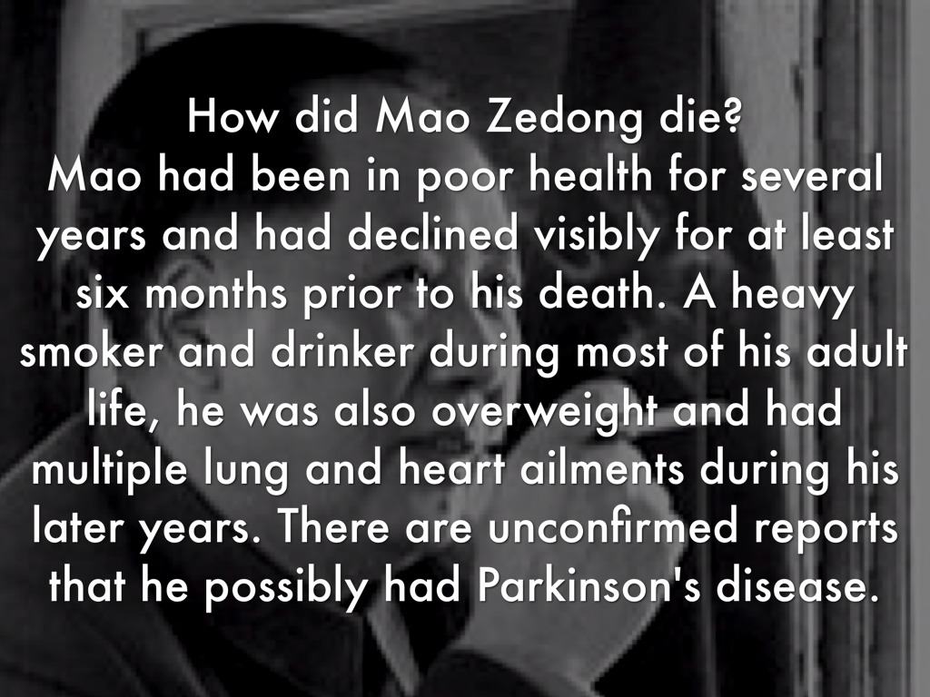 Mao had been in poor health for several years and had declined visibly for at least six months prior to his death. A heavy smoker and drinker during most of his adult life, he was also overweight and had multiple lung and heart ailments during his later years. There are unconfirmed reports that he possibly had Parkinson's disease.