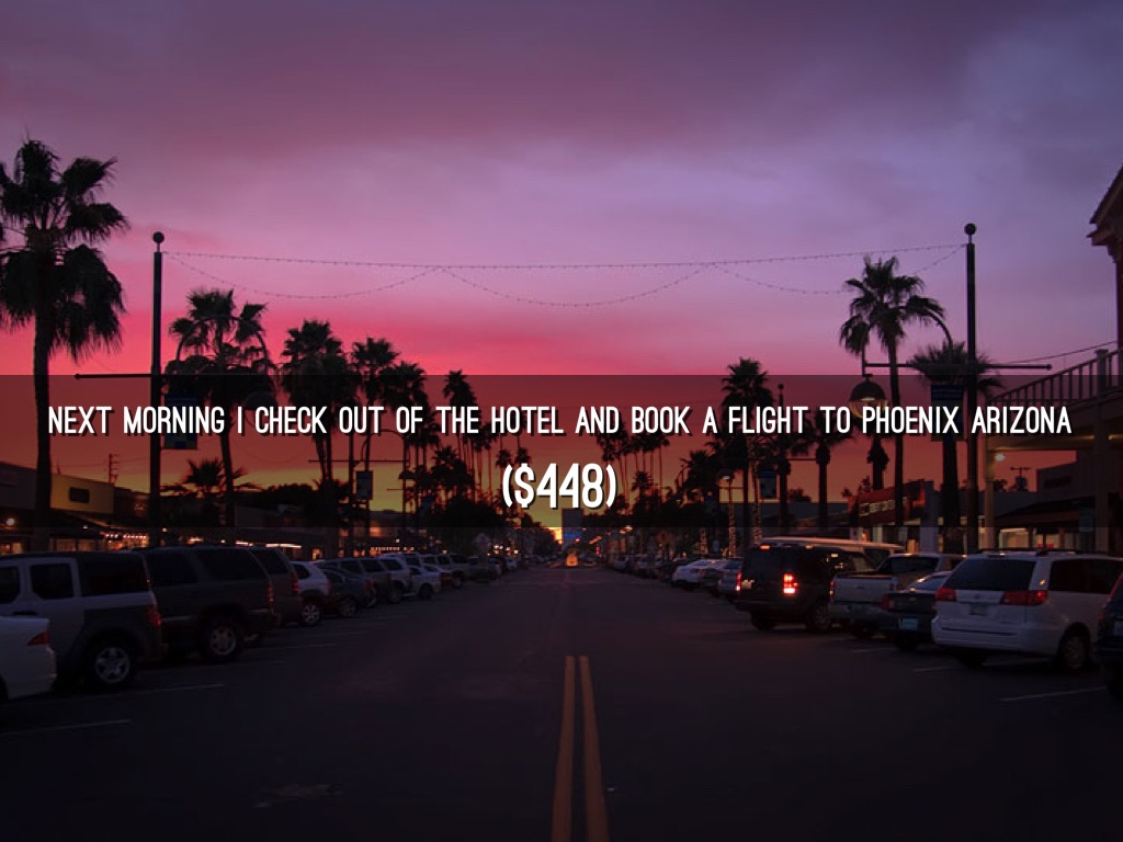 NEXT MORNING I CHECK OUT OF THE HOTEL AND BOOK A FLIGHT TO PHOENIX ARIZONA