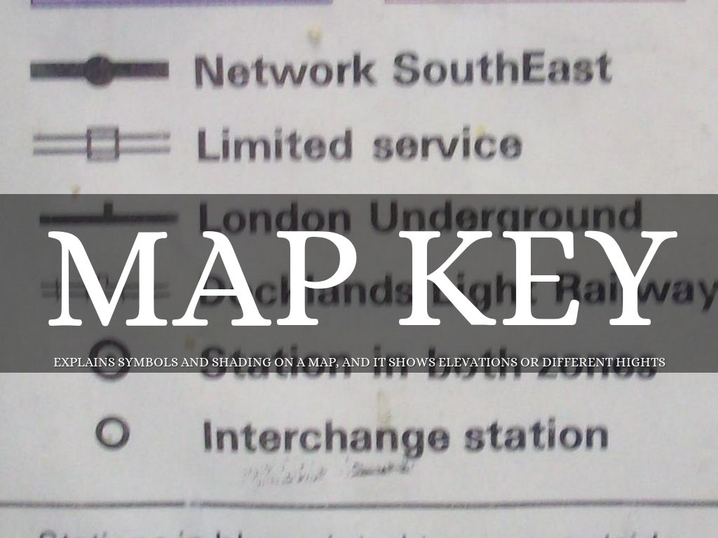 Explains symbols and shading on a map, and it shows elevations or different hights