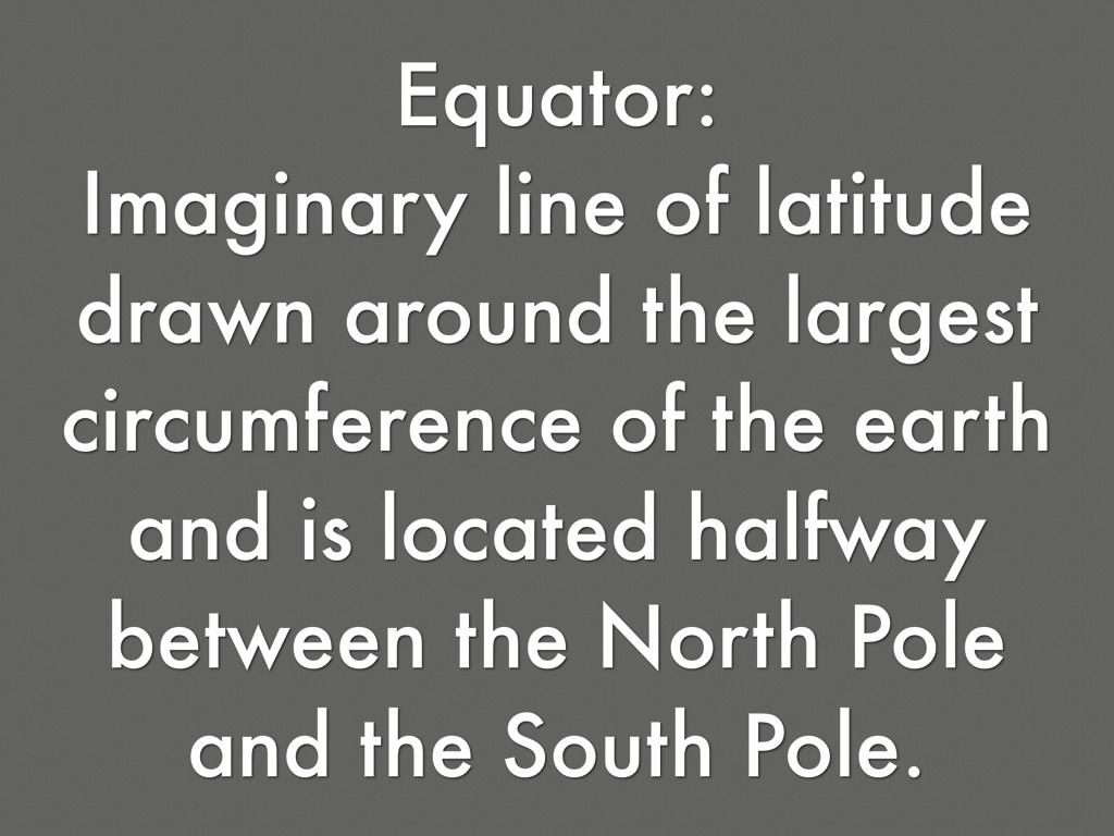 Imaginary line of latitude drawn around the largest circumference of the earth and is located halfway between the North Pole and the South Pole.