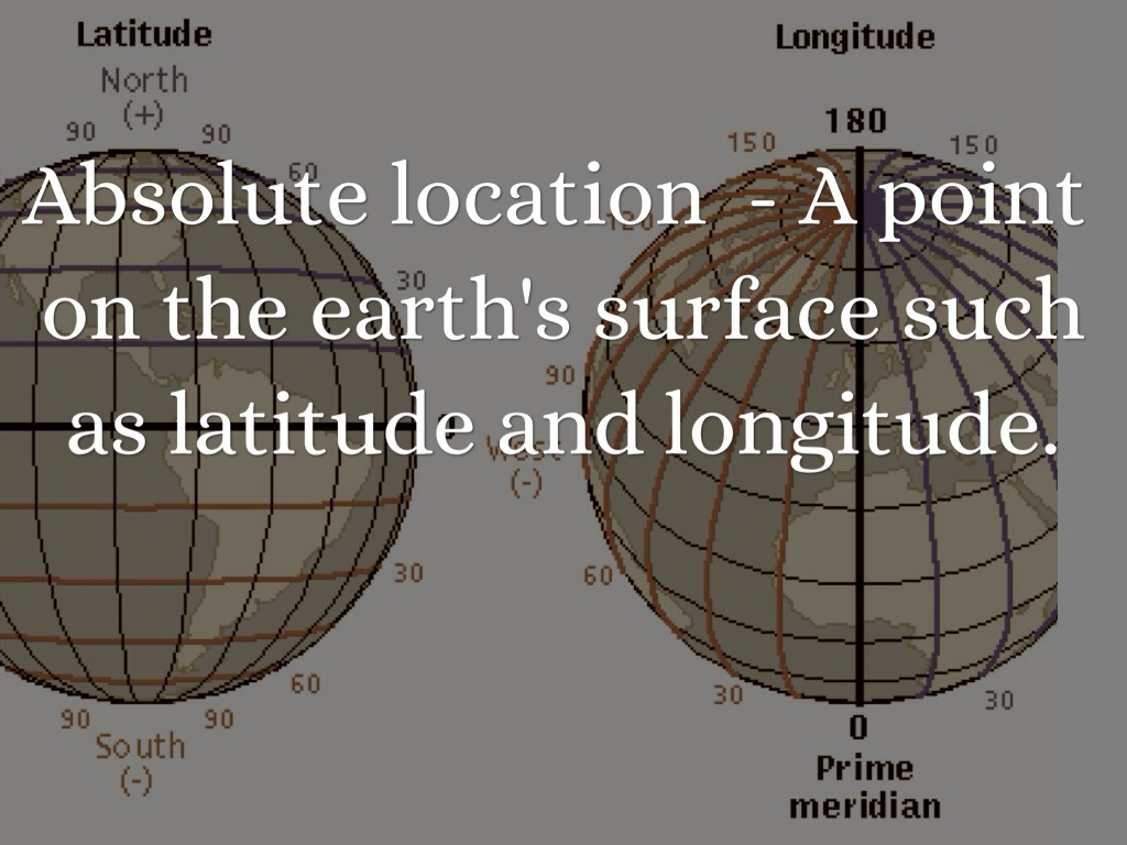 Absolute location - A point on the earth's surface such as latitude and longitude.