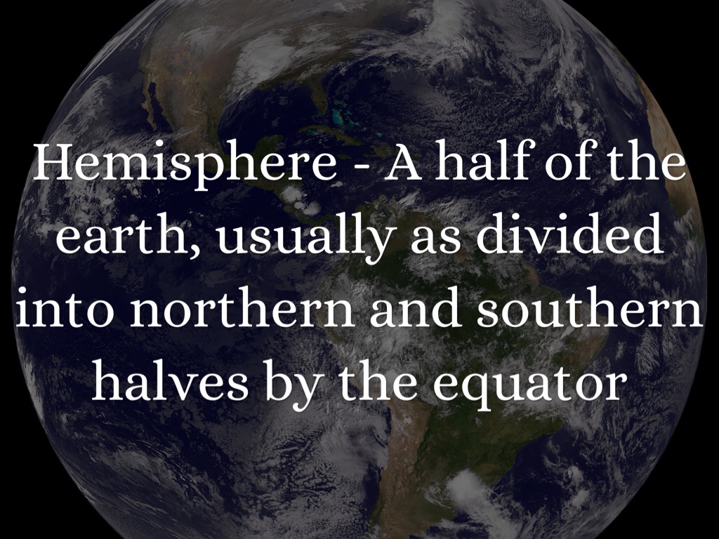 Hemisphere - A half of the earth, usually as divided into northern and southern halves by the equator