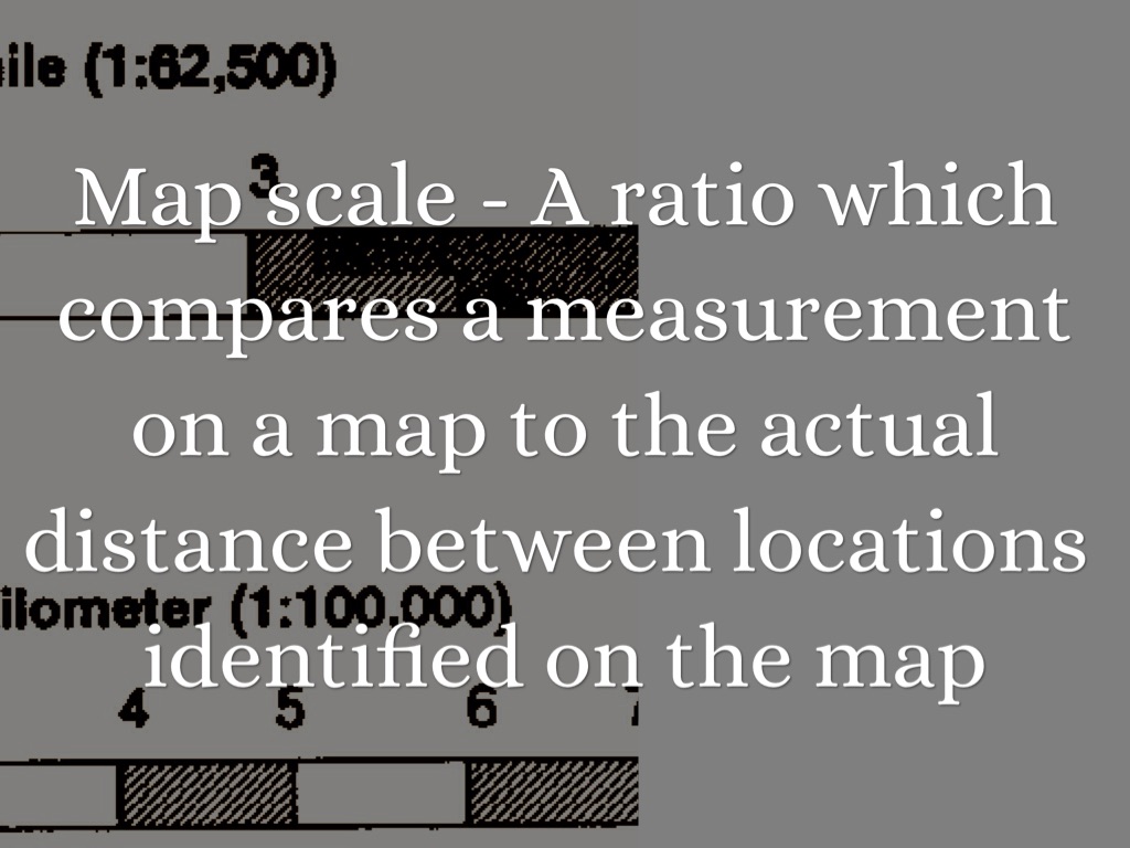 Map scale - A ratio which compares a measurement on a map to the actual distance between locations identified on the map
