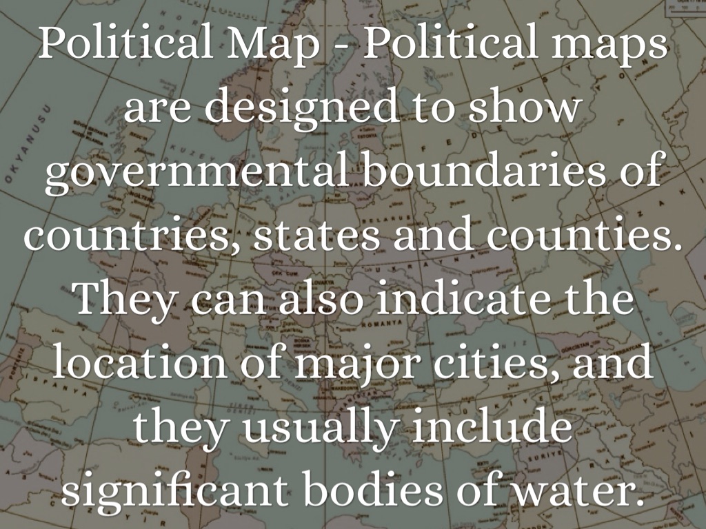 Political Map - Political maps are designed to show governmental boundaries of countries, states and counties. They can also indicate the location of major cities, and they usually include significant bodies of water.