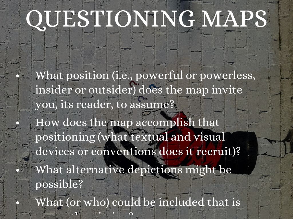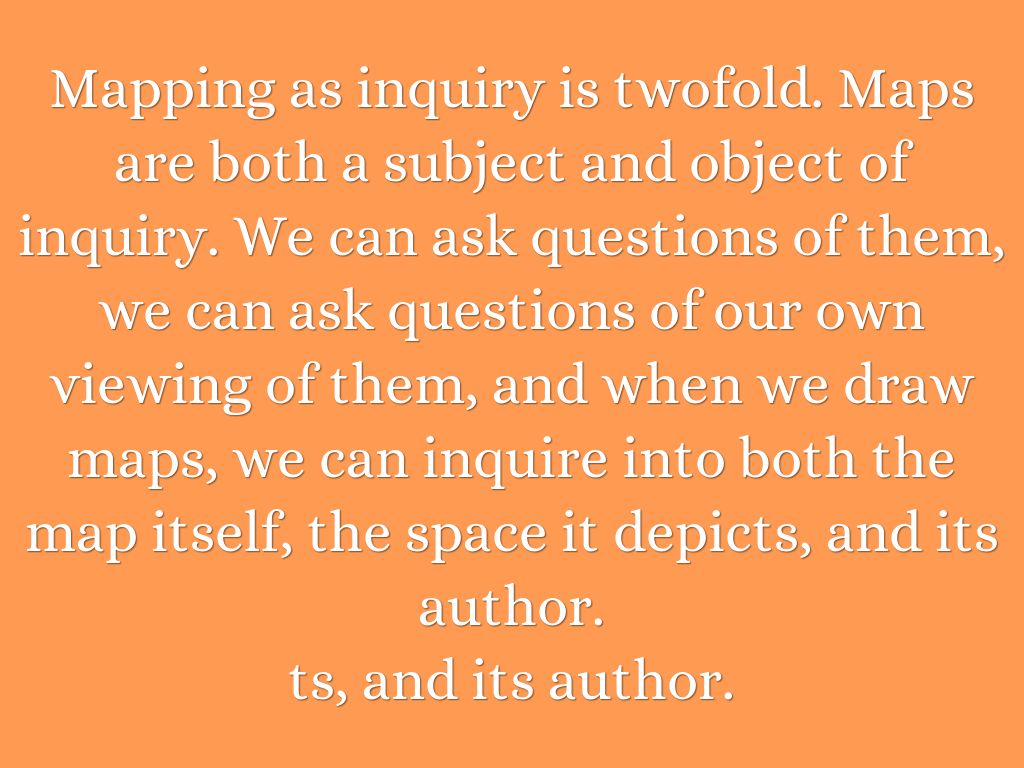 Mapping as inquiry is twofold. Maps are both a subject and object of inquiry. We can ask questions of them, we can ask questions of our own viewing of them, and when we draw maps, we can inquire into both the map itself, the space it depicts, and its author.