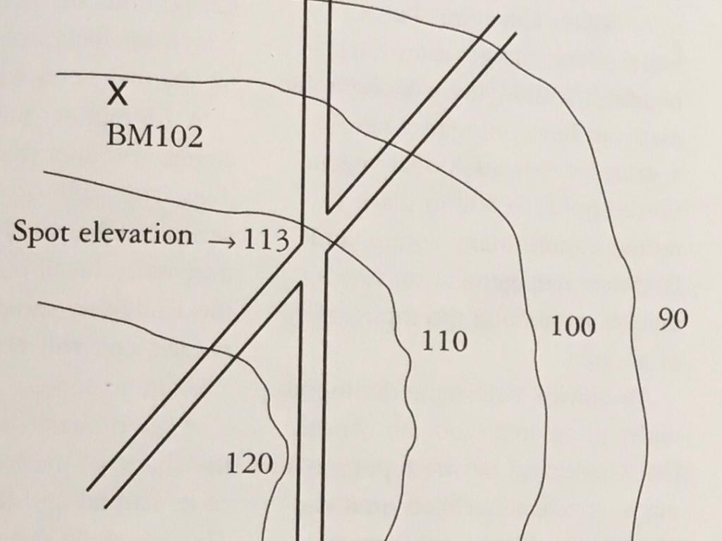 • On map: "BM" next to elevation to nearest foot (i.e. BM102)