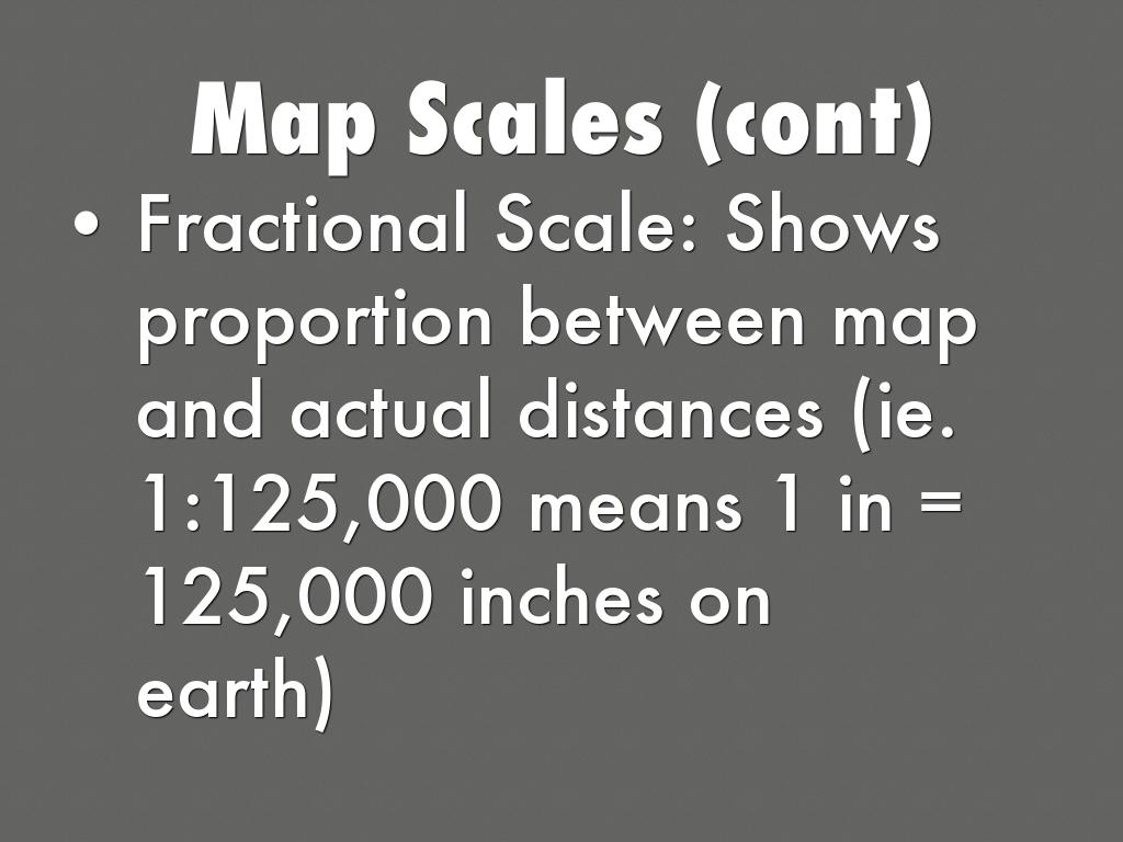 • Fractional Scale: Shows proportion between map and actual distances (ie. 1:125,000 means 1 in = 125,000 inches on earth)