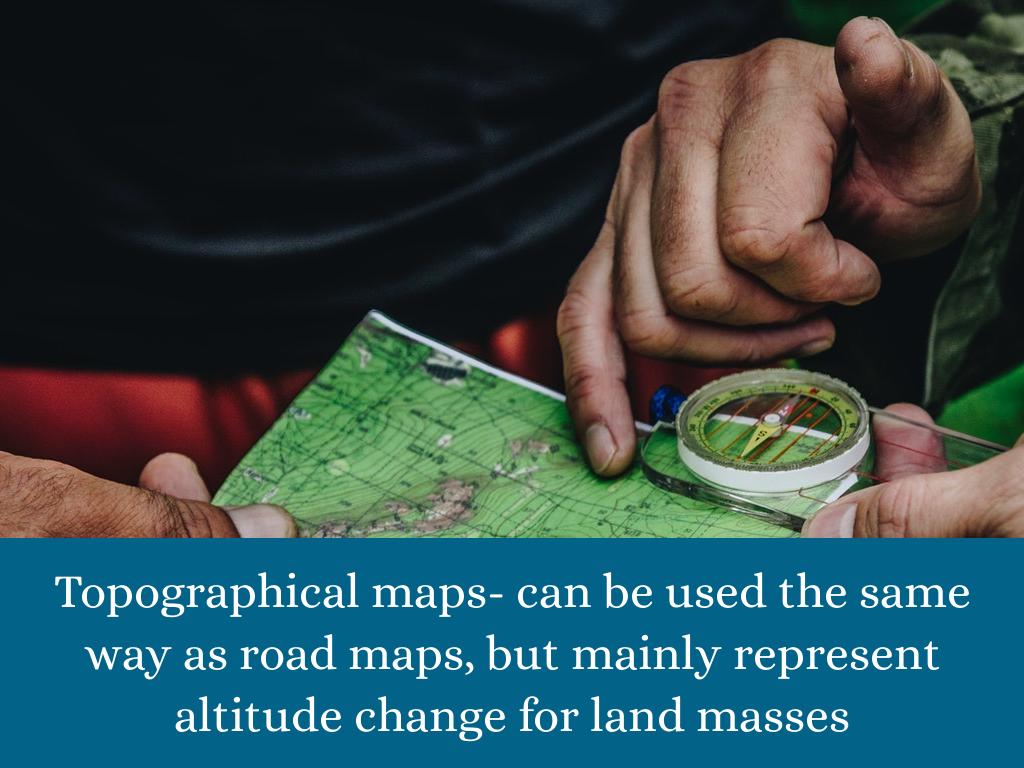 Topographical maps- can be used the same way as road maps, but mainly represent altitude change for land masses
