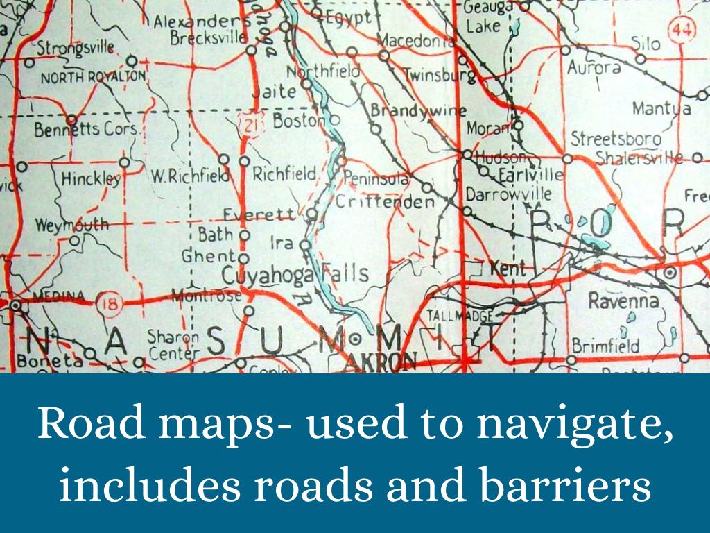 Road maps- used to navigate, includes roads and barriers