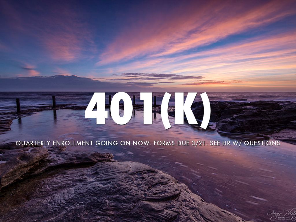 QUARTERLY ENROLLMENT GOING ON NOW. FORMS DUE 3/21. SEE HR W/ QUESTIONS