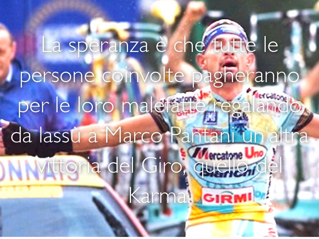La speranza è che tutte le persone coinvolte pagheranno per le loro malefatte regalando da lassù a Marco Pantani un’altra vittoria del Giro, quello del Karma.