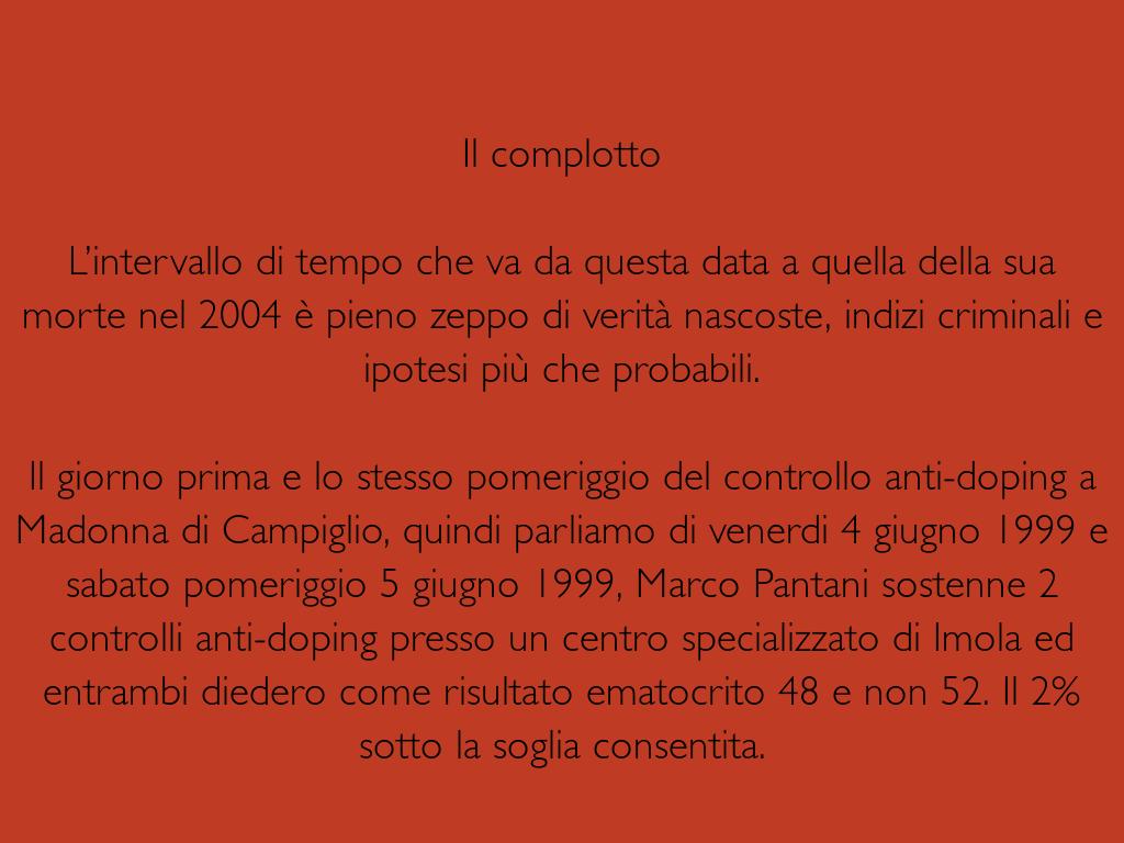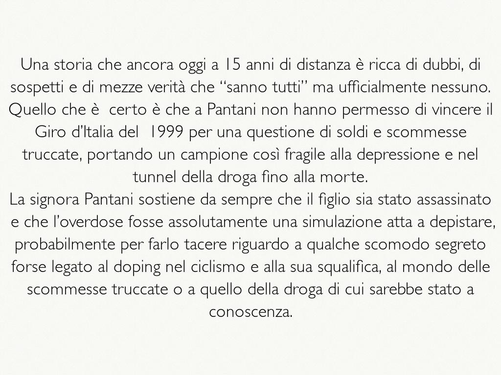 Una storia che ancora oggi a 15 anni di distanza è ricca di dubbi, di sospetti e di mezze verità che “sanno tutti” ma ufficialmente nessuno. Quello che è certo è che a Pantani non hanno permesso di vincere il Giro d’Italia del 1999 per una questione di soldi e scommesse truccate, portando un campione così fragile alla depressione e nel tunnel della droga fino alla morte.