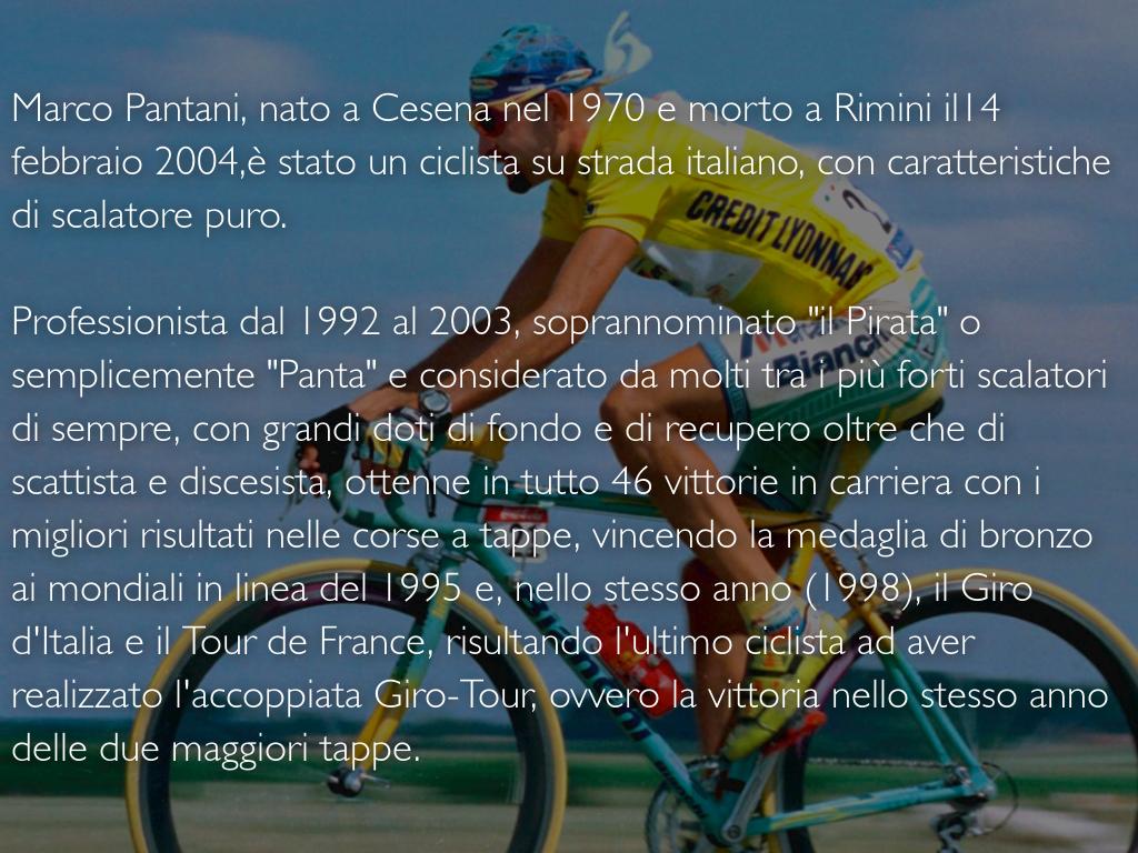 Marco Pantani, nato a Cesena nel 1970 e morto a Rimini il14 febbraio 2004,è stato un ciclista su strada italiano, con caratteristiche di scalatore puro.