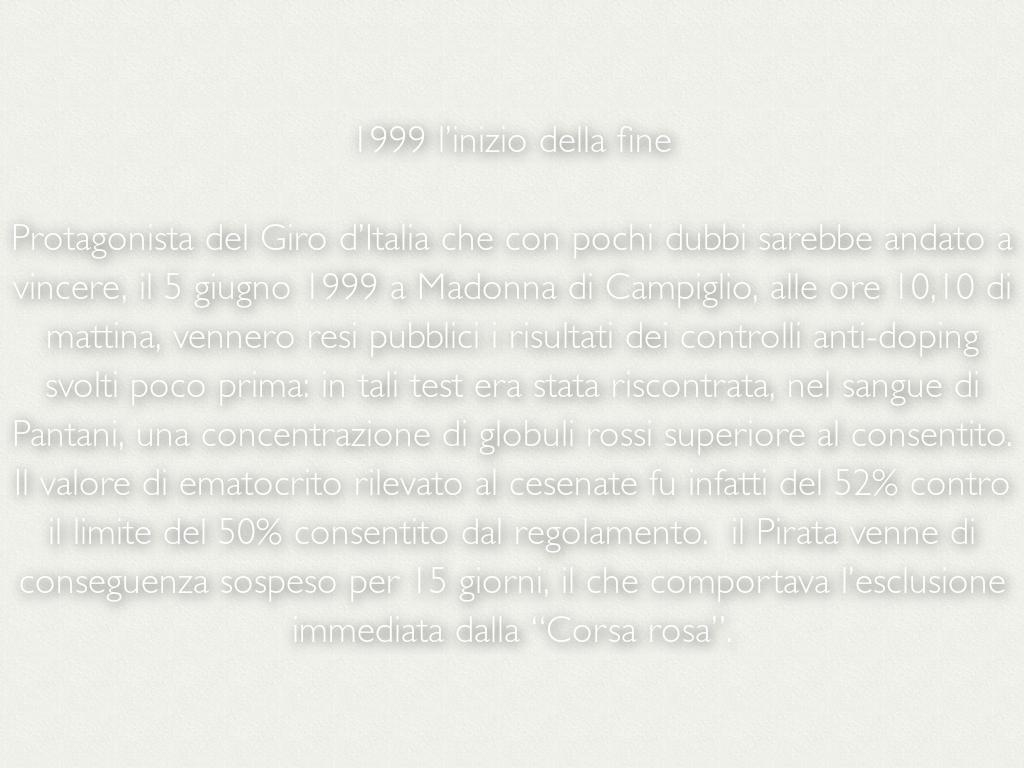 Protagonista del Giro d’Italia che con pochi dubbi sarebbe andato a vincere, il 5 giugno 1999 a Madonna di Campiglio, alle ore 10,10 di mattina, vennero resi pubblici i risultati dei controlli anti-doping svolti poco prima: in tali test era stata riscontrata, nel sangue di Pantani, una concentrazione di globuli rossi superiore al consentito. Il valore di ematocrito rilevato al cesenate fu infatti del 52% contro il limite del 50% consentito dal regolamento. il Pirata venne di conseguenza sospeso per 15 giorni, il che comportava l’esclusione immediata dalla “Corsa rosa”.