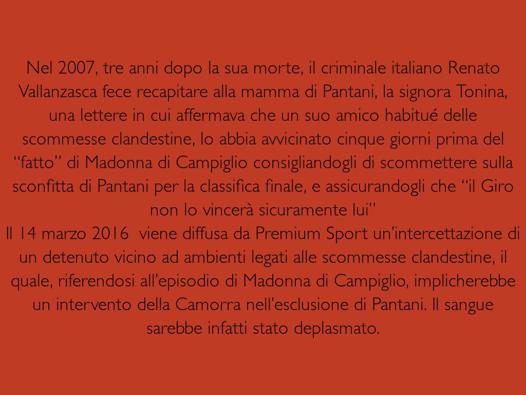 Nel 2007, tre anni dopo la sua morte, il criminale italiano Renato Vallanzasca fece recapitare alla mamma di Pantani, la signora Tonina, una lettere in cui affermava che un suo amico habitué delle scommesse clandestine, lo abbia avvicinato cinque giorni prima del “fatto” di Madonna di Campiglio consigliandogli di scommettere sulla sconfitta di Pantani per la classifica finale, e assicurandogli che “il Giro non lo vincerà sicuramente lui”