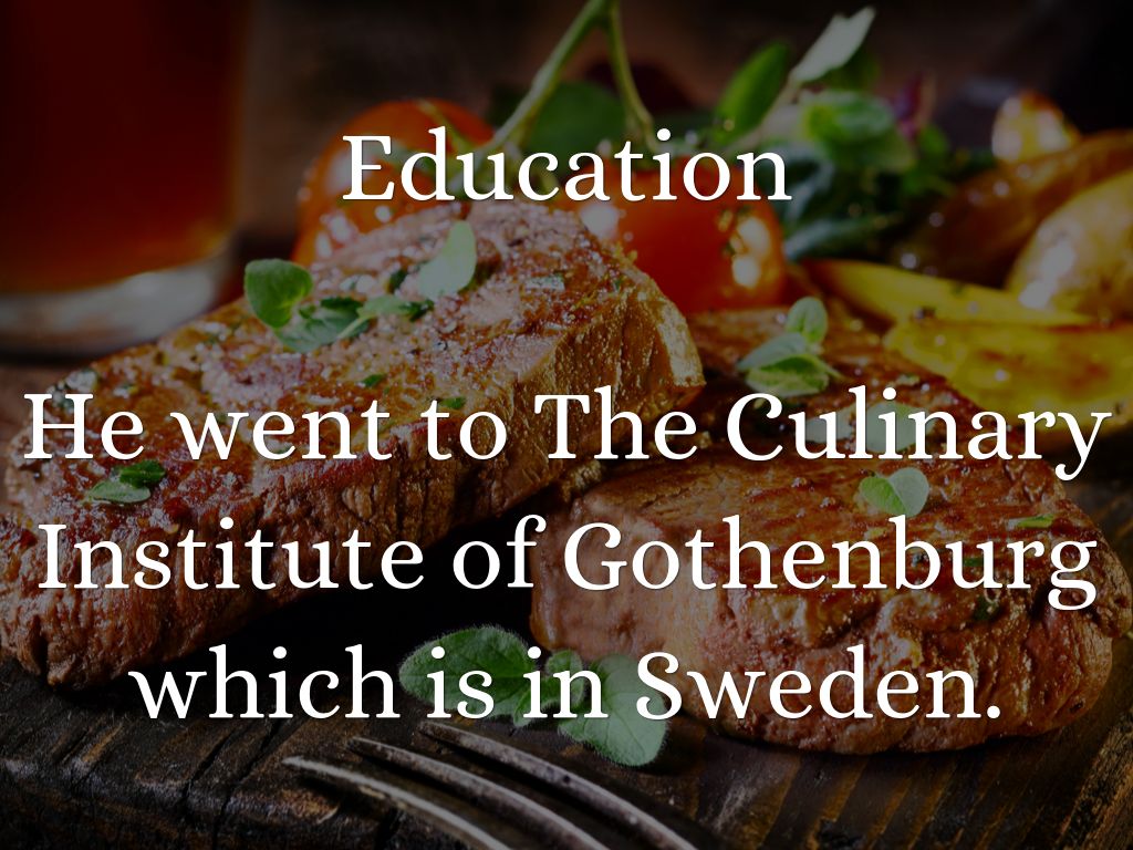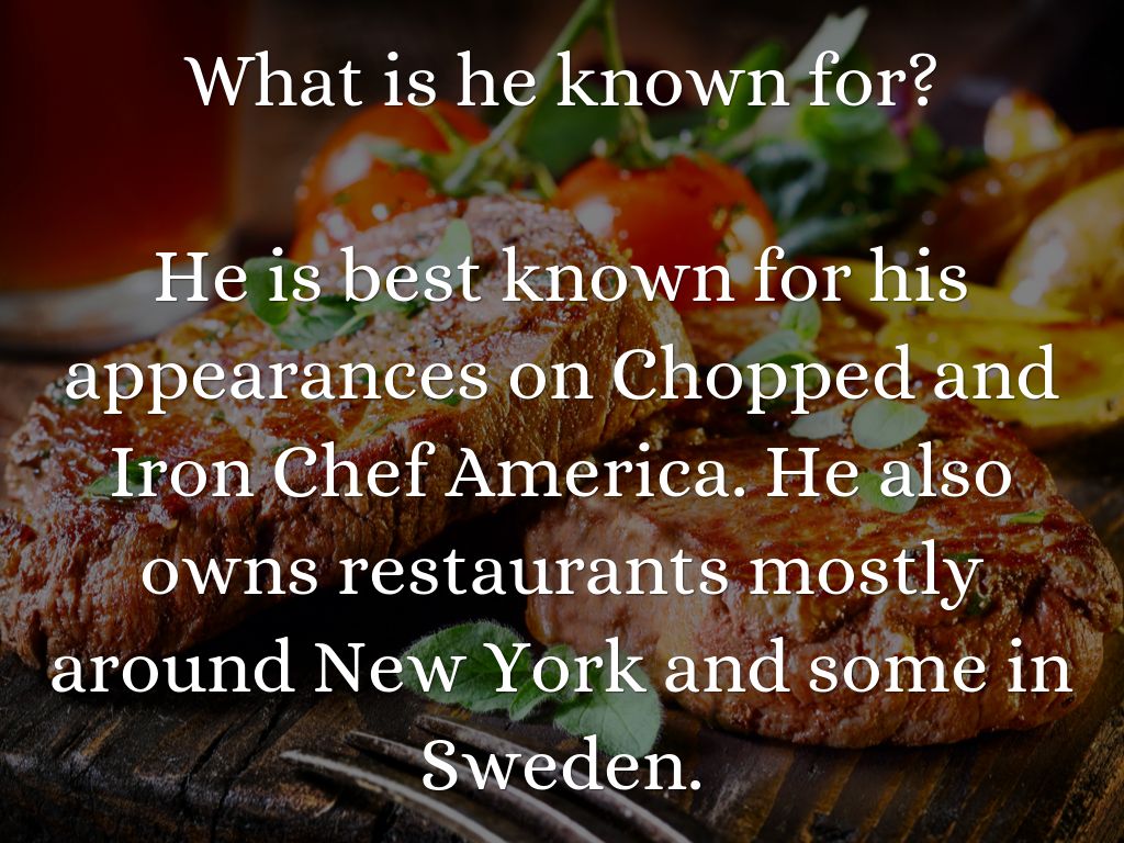 He is best known for his appearances on Chopped and Iron Chef America. He also owns restaurants mostly around New York and some in Sweden.