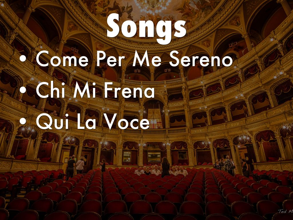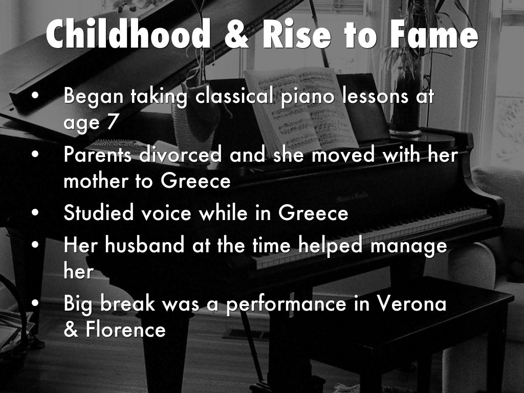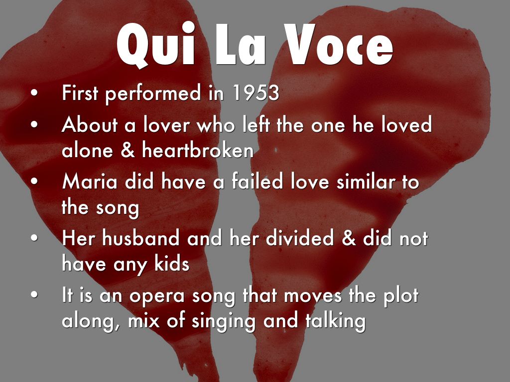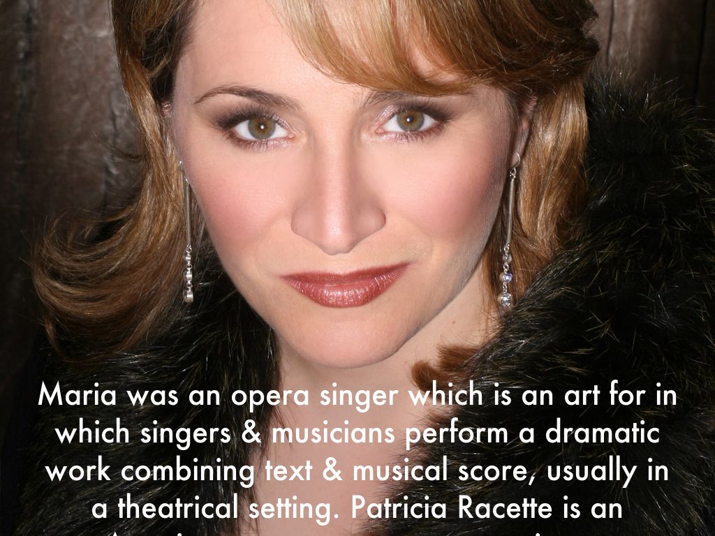 Maria was an opera singer which is an art for in which singers & musicians perform a dramatic work combining text & musical score, usually in a theatrical setting. Patricia Racette is an American contemporary opera singer.