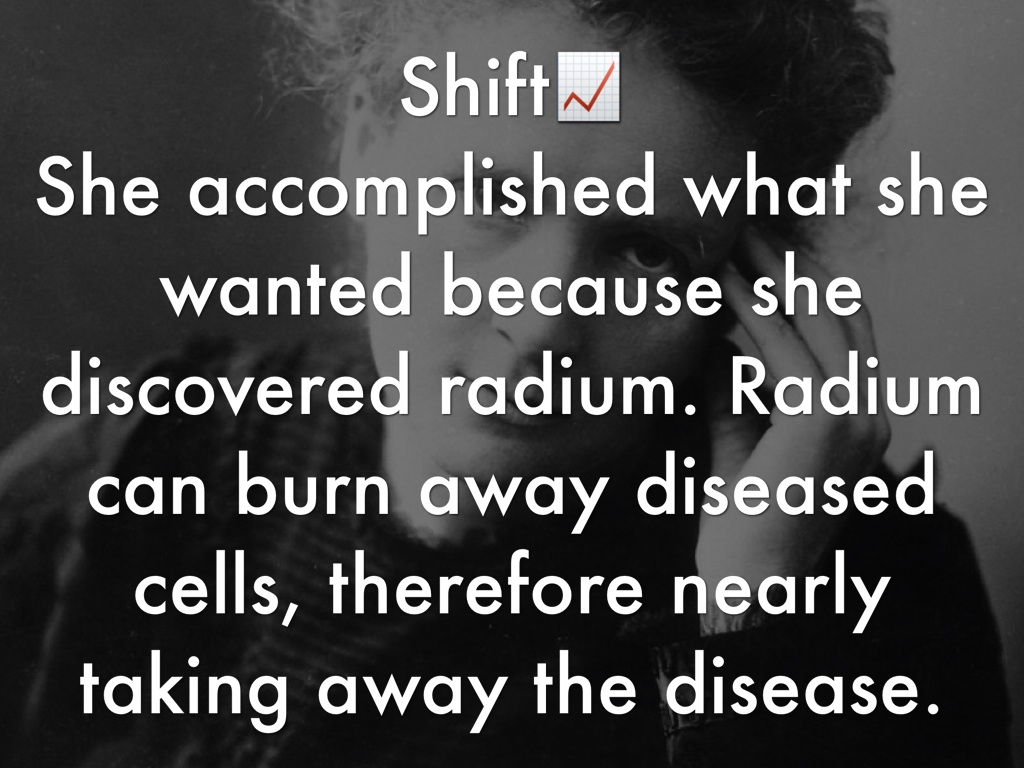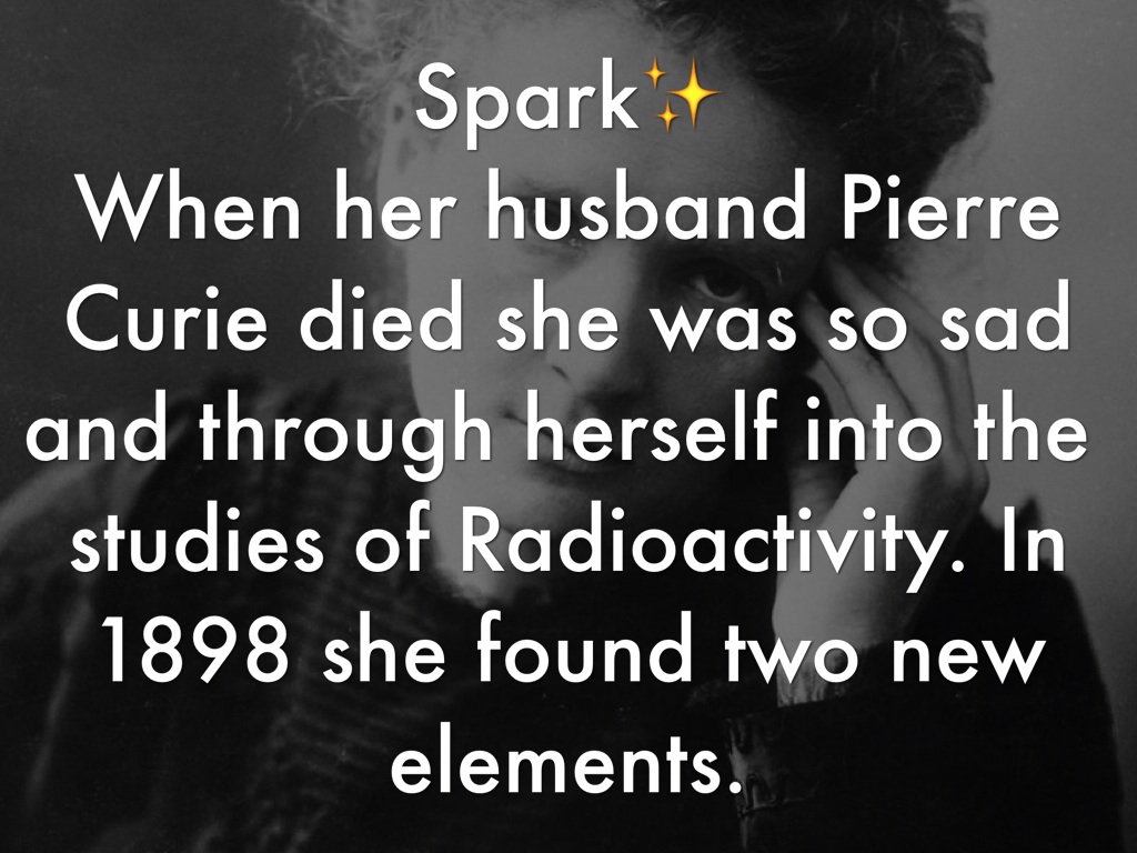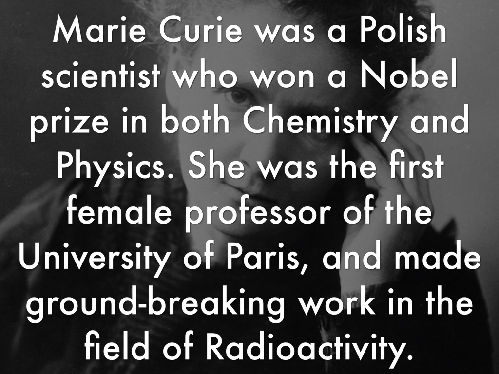 Marie Curie was a Polish scientist who won a Nobel prize in both Chemistry and Physics. She was the first female professor of the University of Paris, and made ground-breaking work in the field of Radioactivity.