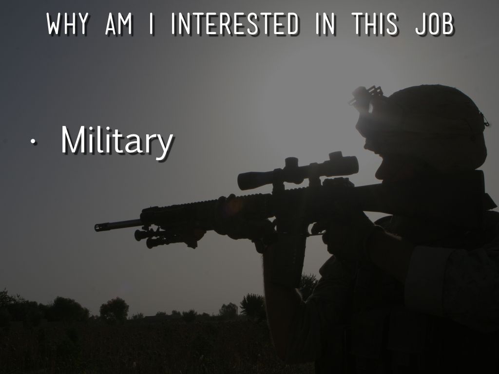 im interesed in this job becuase both of my by grampa on both sides where in the mliltary my grampa was in the army and he accualy was the top guy he jumped out of planes my mom was also in the millitary. and my uncle was a marine to.
