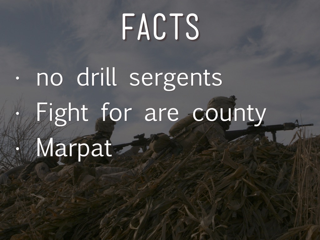 the marine corps does not have drill sergeats that is the other branches they have drill instructors they often where desert Marpat and woodland Marpat came as Sean on slide 3