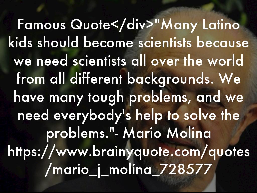 Famous Quote"Many Latino kids should become scientists because we need scientists all over the world from all different backgrounds. We have many tough problems, and we need everybody's help to solve the problems."- Mario Molina https://www.brainyquote.com/quotes/mario_j_molina_728577