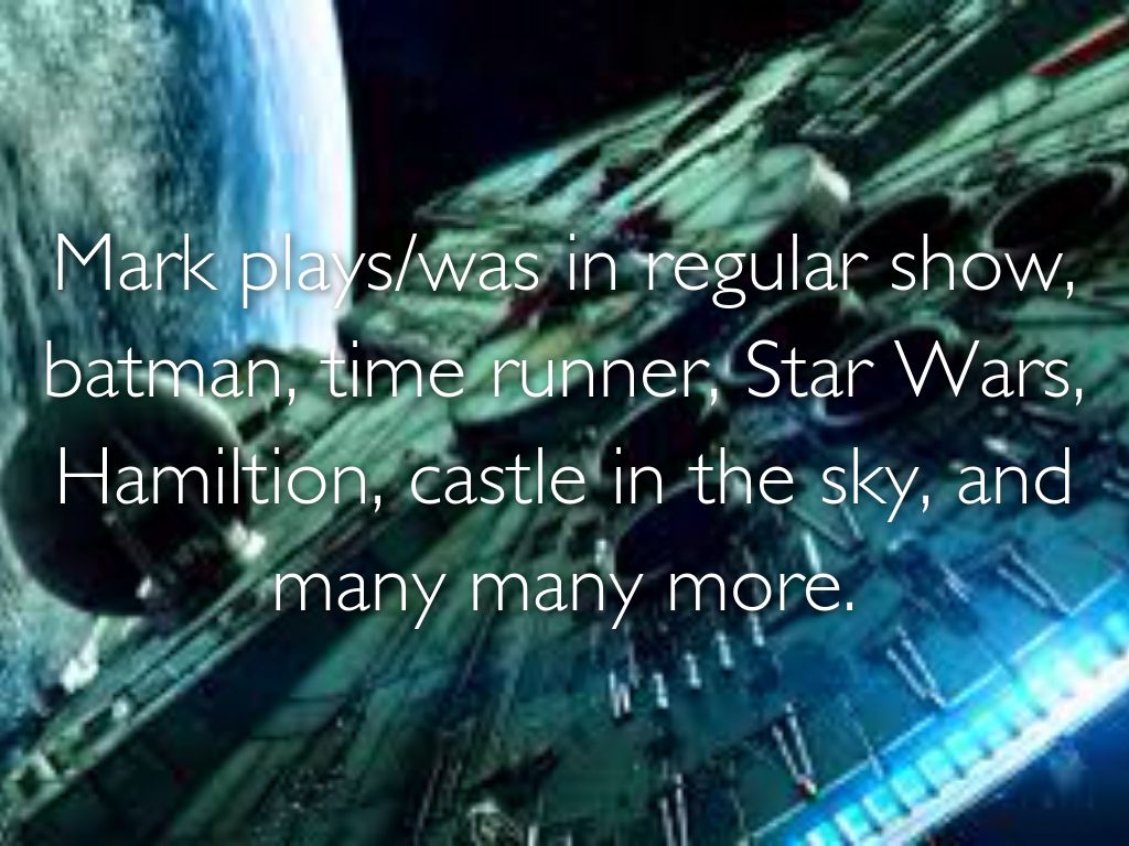 Mark plays/was in regular show, batman, time runner, Star Wars, Hamiltion, castle in the sky, and many many more.