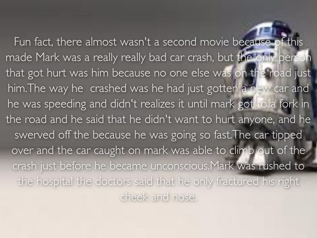 Fun fact, there almost wasn't a second movie because of this made Mark was a really really bad car crash, but the only person that got hurt was him because no one else was on the road just him.The way he crashed was he had just gotten a new car and he was speeding and didn't realizes it until mark got to a fork in the road and he said that he didn't want to hurt anyone, and he swerved off the because he was going so fast.The car tipped over and the car caught on mark was able to climb out of the crash just before he became unconscious.Mark was rushed to the hospital the doctors said that he only fractured his right cheek and nose.