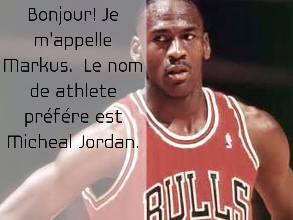 Bonjour! Je m'appelle Markus. Le nom de athlete préfére est Micheal Jordan.