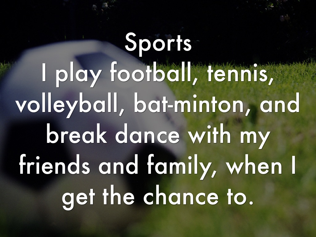 I play football, tennis, volleyball, bat-minton, and break dance with my friends and family, when I get the chance to.