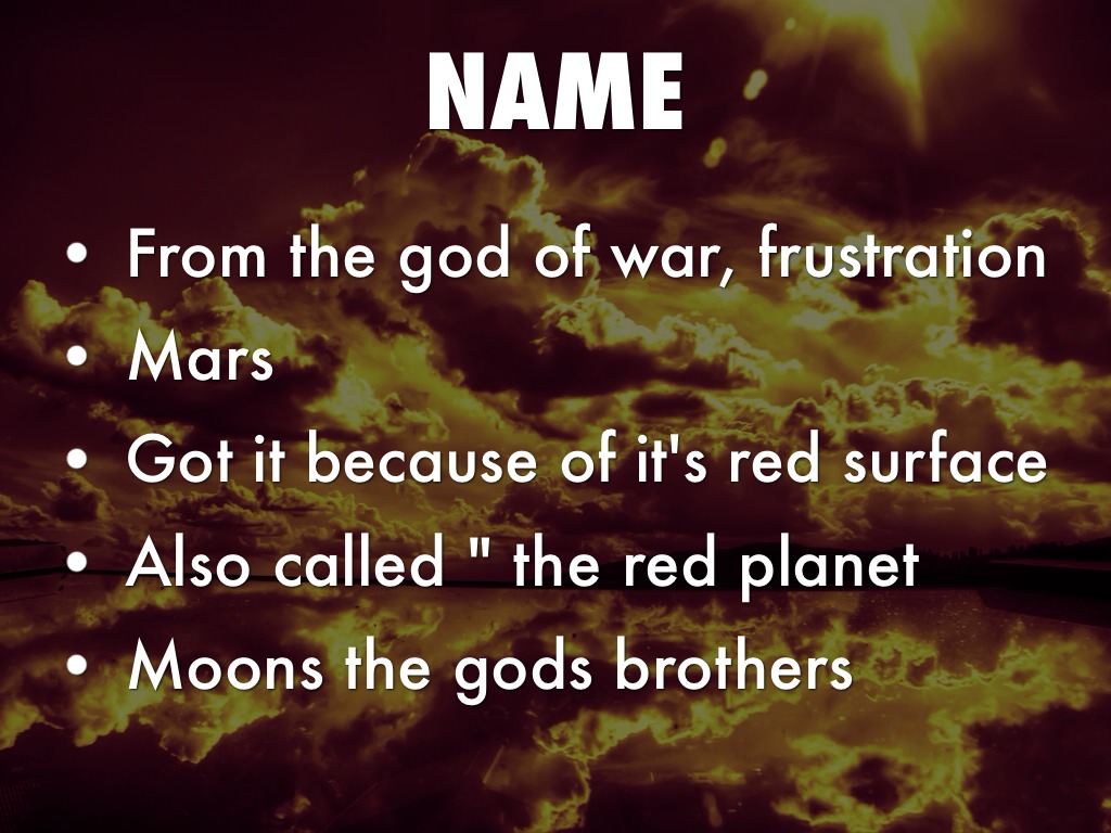 For hundreds of years ago,when the sun and the moon where the only visible things seen in the sky,expect for a red dot(Mars) they didn't know what it was and the dot became a frustration. To name it, they thought of something that was a frustration.